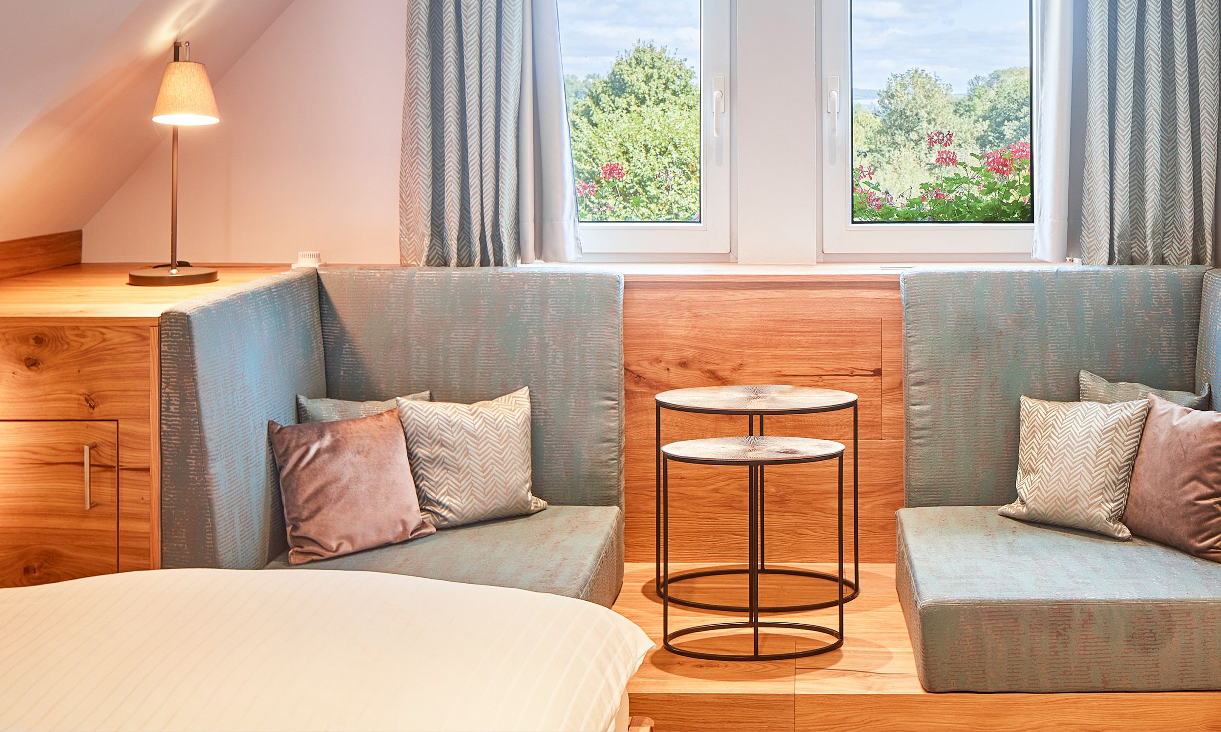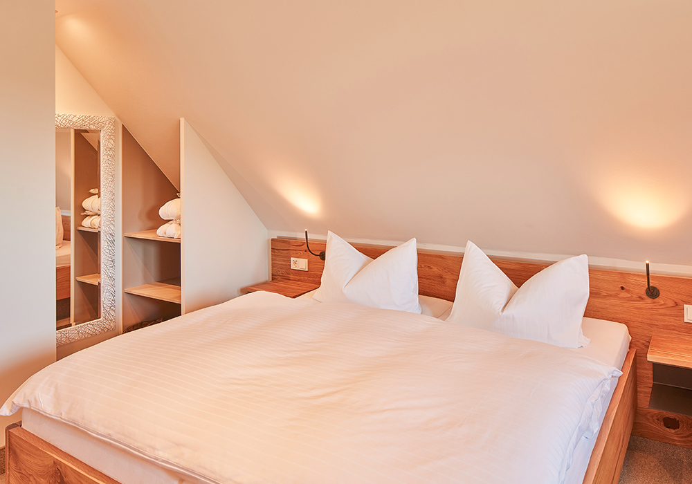 Unsere Heimatliebe-Zimmer verfügen über ein King-Size-Bett, Sitzgelegenheit und laden durch Ihre Gemütlichkeit zum Wohlfühlen und Entspannen ein. Ideal für kurze Aufenthalte.
